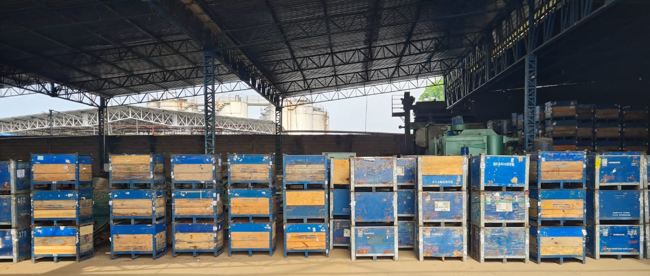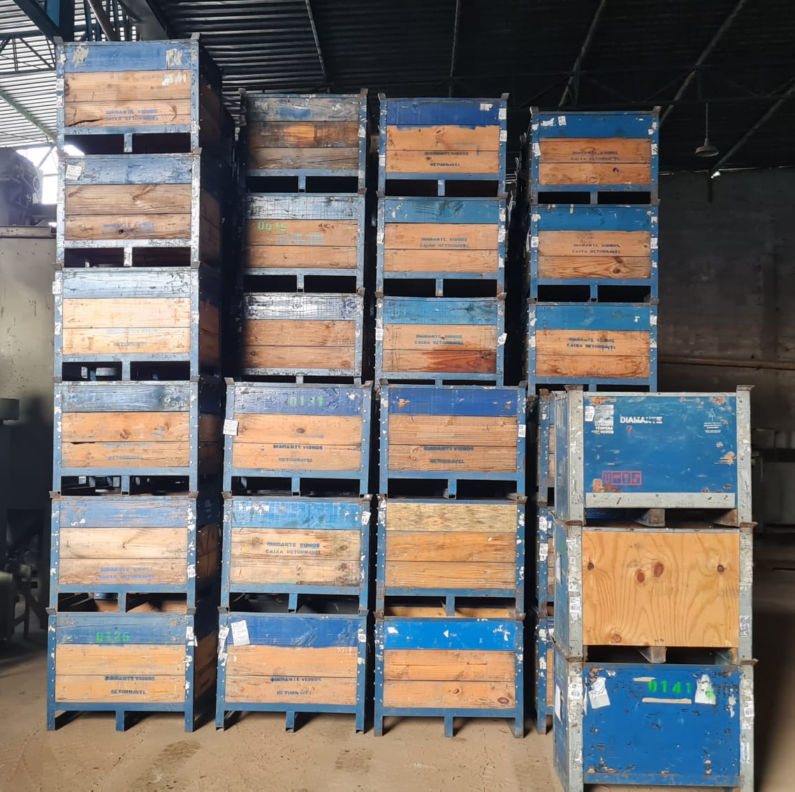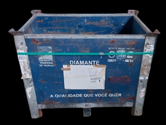 Caixas p/ armazenamento Dimensões: 900 x 600 x 600mm, base, laterais e reforços em cantoneira, fechamento madeira.